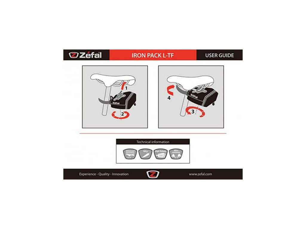 Aerodynamická podsedlovka Stejně jako u předchozího modelu je konstrukce Iron Pack 2 extrémně robustní. Nabízí však více modernosti a aerodynamiky. Velký otvor pro snadný přístup, upevnění - systém T-Fix.Vodotěsný zip.