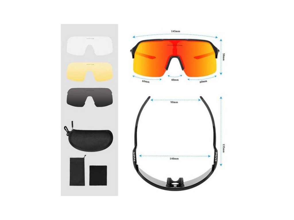 Součástí balení jsou 4 vyměnitelná skla (barevné zrcadlové, polarizační, žluté, čiré)