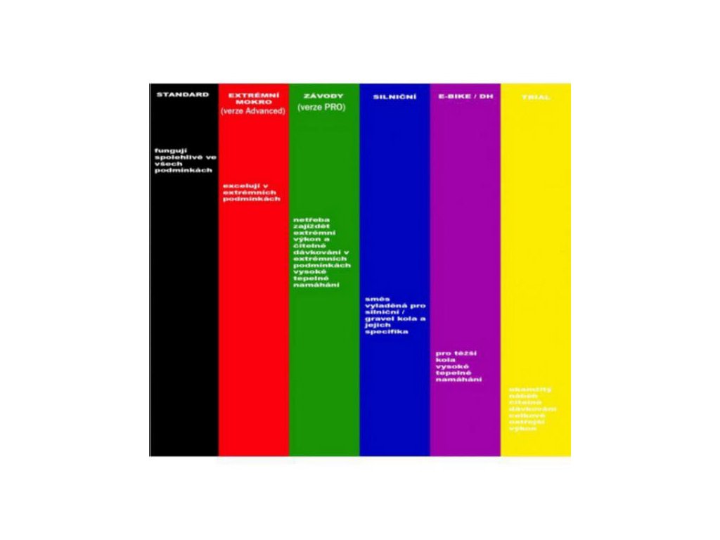 E-BIKE A DH SPECIÁLY (fialové): jsou vyvinuty pro vyšší tepelné namáhání, které ocení především DH závodníci a jezdci na e-biku, ale nejen ti. Klidně i silničáři, kteří očekávají dlouhé sjezdy a brždění.