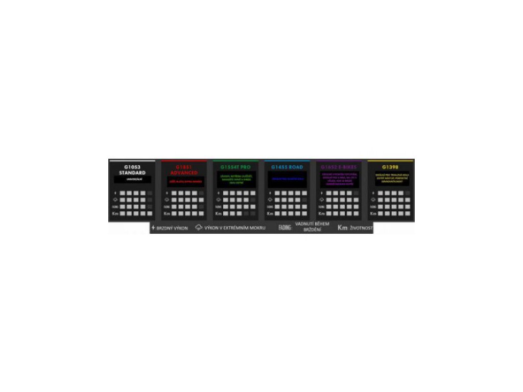 STANDARDNÍ (černé): ty vyhovují povšechným podmínkám. Mají tvrdší směs a tím i nejdelší životnost. Jejich brzdná síla je spolehlivá ve všech podmínkách.
