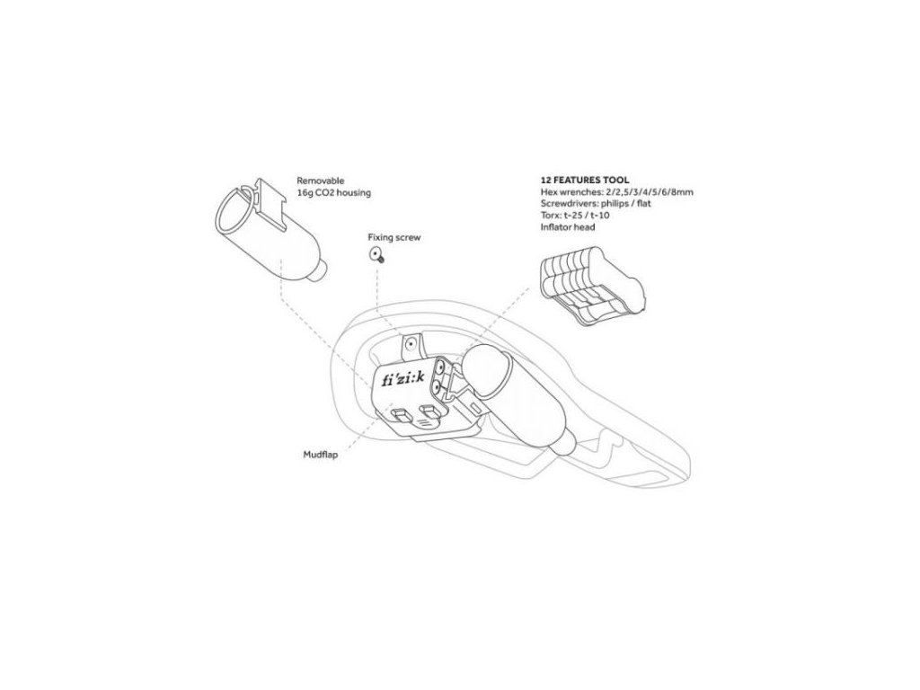 Sada obsahuje: inbusy 2/2,5/3/4/5/6/8mm, křížový a plochý šroubovák, torx T10 a T25 a hlavice na CO2 bombičku