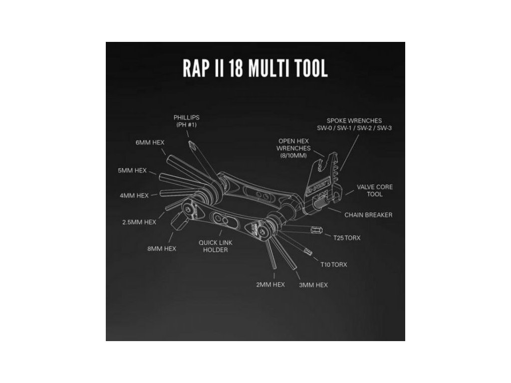 Sada obsahuje: imbusové klíče 2 / 2,5 / 3 / 4 / 5 / 6 a 8 mm, torx klíče T10, T25, křížový (Phillips) šroubovák, klíč 8 / 10 mm, centrklíč SW-0, SW-1, SW-2, SW-3, nýtovač, kleště na rychlospojku.