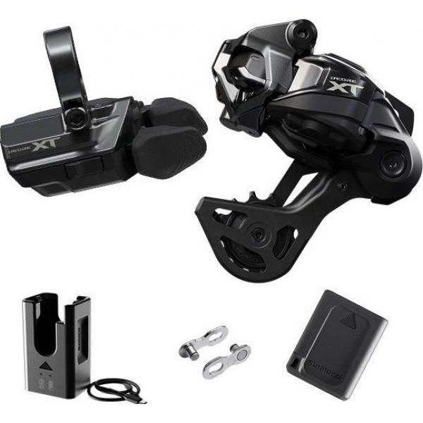 Obsah: Přehazovačka Shimano XT Di2 RD-M8250-GS, 12 rychlostí Řadicí páka Shimano XT Di2 SW-M8250-R pravá s objímkou Baterie Shimano Di2 BT-DN320 Nabíječka Shimano EC-DN100 Spojka řetězu Shimano SM-CN910-12 Quick Link